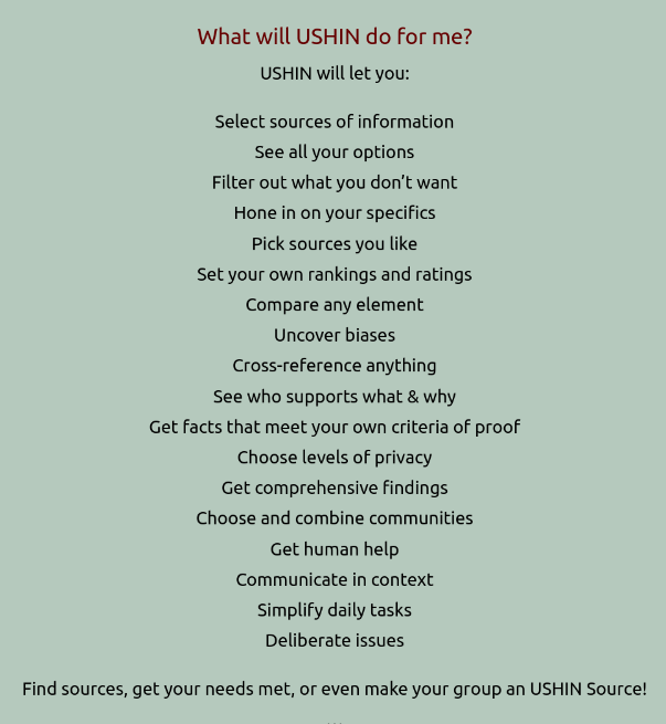 What ushin shapes provide is a level of utility for deliberation and the building of a universally shared and collectively pruned information network. Additionally such a system would allow greater diversity, autonomy, choices of publishing hosts which offer relative options for privacy. The adoption of ushin shapes has the potential to allow equalization of information control and personal, group agency regarding what information is displayed on one’s screen.