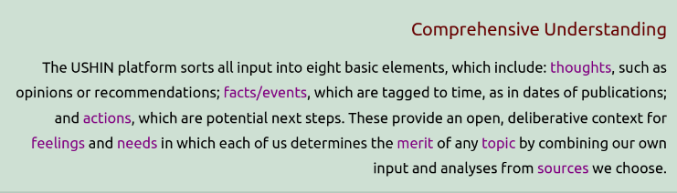 The ushin vision of a mature deliberation system has been to offer tools for people to easily tag input on semscreens and view input in various displays for finding, comparing, evaluating data toward a highly extendible shared database.