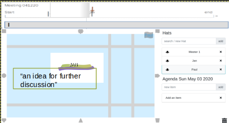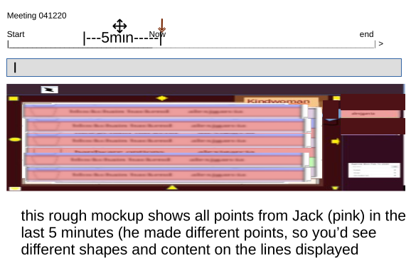 u4few was conceived as a program for taking notes during a meeting. It offered a timeline for topics and decision so it would be easy to find what was said by topic, person, time or tag, view related documents, and deliberate using shapes in a small group process.